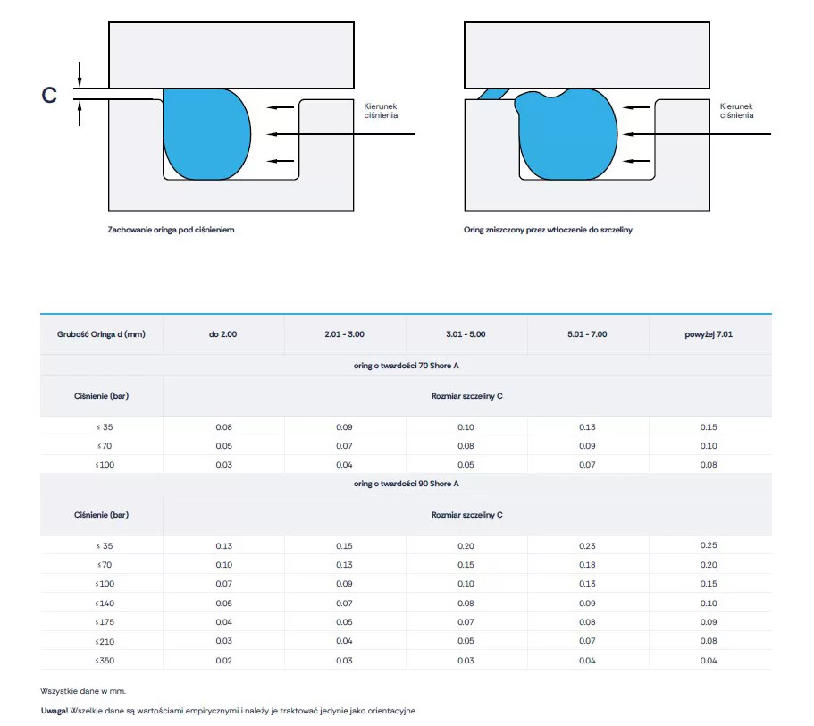 Ciśnienie robocze uszczelnienie Typu Oring zależy od grubości oringa oraz od szczeliny.