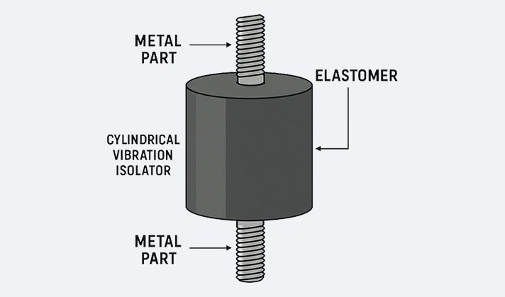 Wibroizolator cylindryczny to element w kształcie walca, najczęściej wykonany z elastomeru (np. gumy NBR, EPDM) połączonego z częściami metalowymi. Stosuje się go pomiędzy maszyną a podłożem lub konstrukcją nośną, aby ograniczyć przenoszenie wibracji.