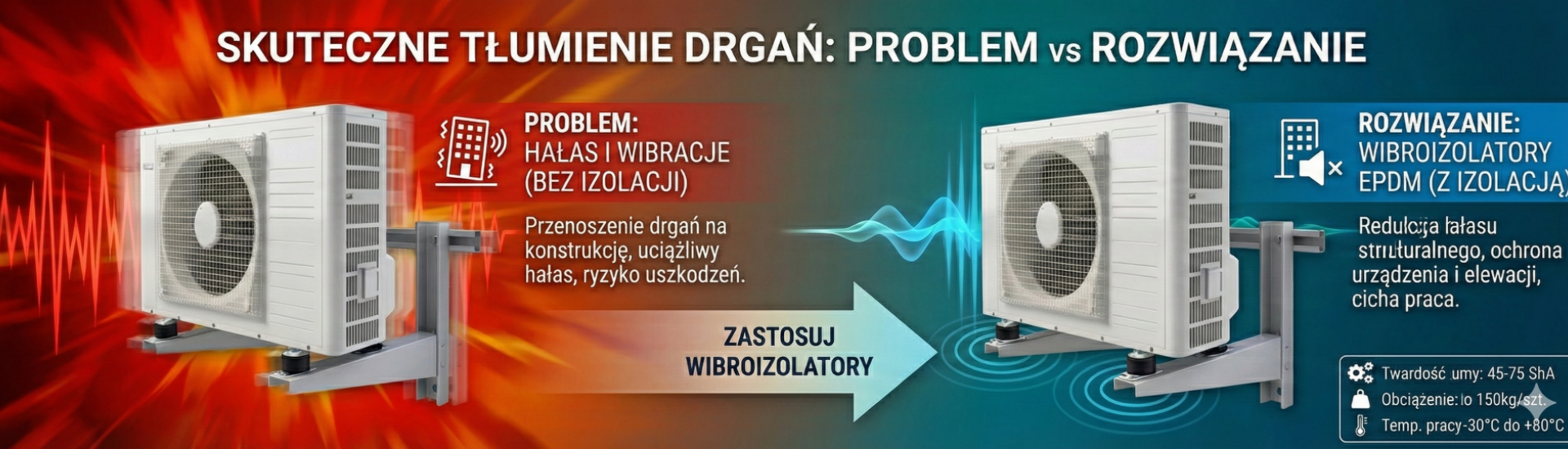 - Redukcja wibracji- zestaw został zaprojektowany aby skutecznie redukować wibracje zewnętrznych jednostek klimatyzacji